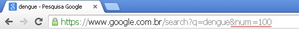 | Altere quantidade de resultados por página Você pode aumentar ou diminuir a quantidade de resultados de uma consulta no Gooogle. Basta acrescentar na URL da barra de endereços a expressão &num= seguida do valor desejado de resultados. Exemplo para a apresentação de 100 resultados em uma página: